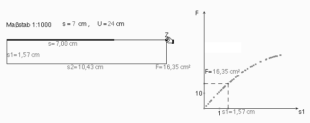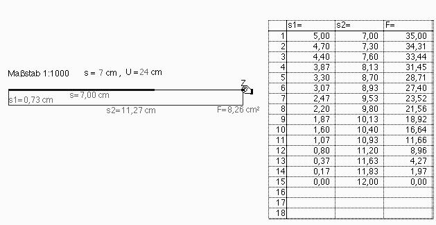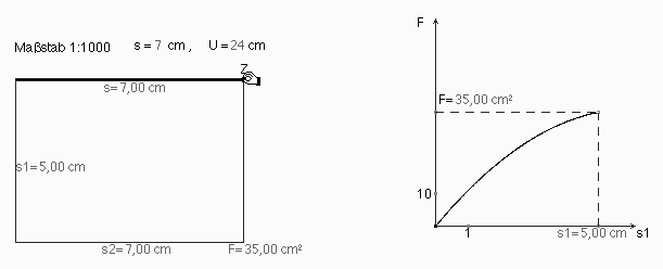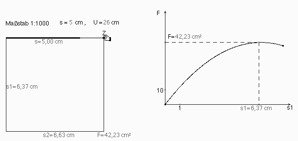 Zur grafischen Veranschaulichung der funktionalen Abhängigkeit s1 ® F(s1) bei festem U und s werden s1 und F auf der s1-Achse und F-Achse abgetragen. Der Punkt (s1; F) erzeugt das Schaubild als Spur (Abb. 3), die für Untersuchungen bei Variation der Parameter s und U durch ein grafisches Objekt ersetzt wird (Abb.4a). Das Randmaximum ist nicht invariant; z.B. für s = 5 (cm) und U = 26 (cm) erhalten wir ein relatives Maximum für den Flächeninhalt, das zugleich absolutes Maximum ist (Abb. 4b). Welches ist die Bedingung für diesen Wechsel?...
