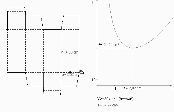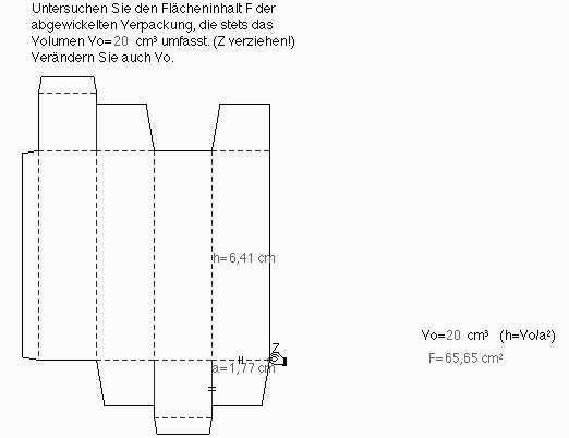 Der Flächeninhalt eines real existierenden Typs von Verpackungsnetzen ist zu untersuchen (Abb. 5a). Dabei ist das "verpackte" Volumen invariant. (Solche Netze können auch ausgedruckt, ausgeschnitten und ausgefaltet werden.) Durch Verziehen erzeugen wir unterschiedliche (nicht äquiforme) Verpackungsnetze mit unterschiedlicher Flächenbeanspruchung (Abb.5b). Mittels des Schaubildes bestimmen wir das Flächenminimum näherungsweise (Abb. 6). Die Art des Minimums erweist sich bei Variation des Parameterwertes V0 als invariant.