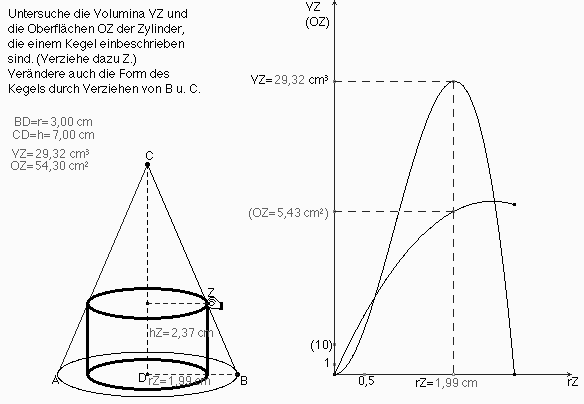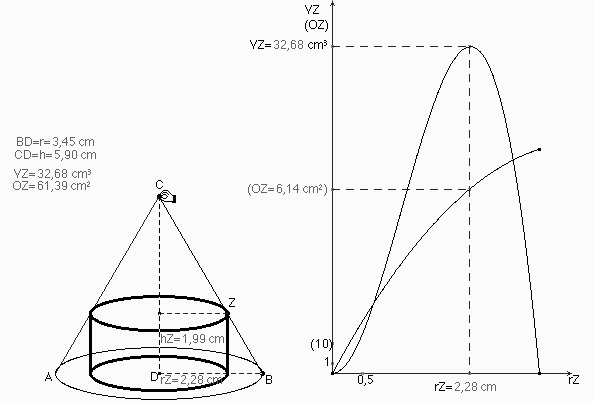 Unter den einbeschriebenen Zylindern hat einer maximales Volumen, ein anderer maximale Oberfläche (Abb. 7a). Ist dieses Extremalverhalten invariant bei Änderung der Kegelform? So gibt es beispielsweise für einen Kegel mit r = 3,45 LE und h = 5,90 LE keinen eingeschriebenen Zylinder mit maximaler Oberfläche mehr (Abb. 7b).