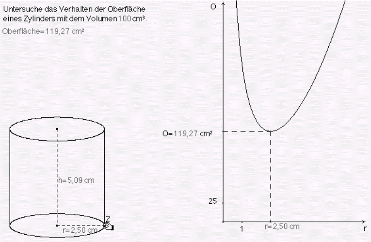 Unter allen volumengleichen Zylindern gibt es nur einen, der minimale Oberfläche hat. Seine volumenabhängigen Daten können wir näherungsweise ablesen (Abb. 8). Diese Aufgabe dient einer ersten groben Modellierung des Anwendungsproblems unter allen Verpackungsdosen, die mit dem geringsten Materialaufwand zu bestimmen.