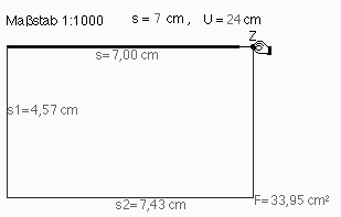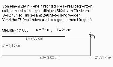 Die Abbildung 1a zeigt die offene Aufgabenstellung. Durch Verziehen von Z (symbolisiert durch die greifende Hand) verändert sich die Form des "Zaunrechtecks", dessen Umfang sich nicht ändert, wohl aber die anderen Daten (Abb. 1b); auch die Grenzlage für s1=0 cm kann realisiert werden (für die Messung des Flächeninhaltes steht ein Werkzeug zur Verfügung). Bereits hier kann der Nutzer des interaktiven Arbeitsblattes feststellen, daß der Flächeninhalt streng monoton von s2=s nach s2=U/2 abnimmt und daß das Flächenmaximum 3500m2 bei den Abmessungen 50m auf 70mangenommen wird. Die Flüchtigkeit der einzelnen Zustände erschwert eine überblickende Bewertung der entsprechenden Daten. Deswegen können diese in eine Tabelle eingetragen werden (Abb. 2). Hier könnten wir noch die Spalte s2 - s1 anfügen, die zeigt, wie der Flächeninhalt bei abnehmender Differenz zunimmt.