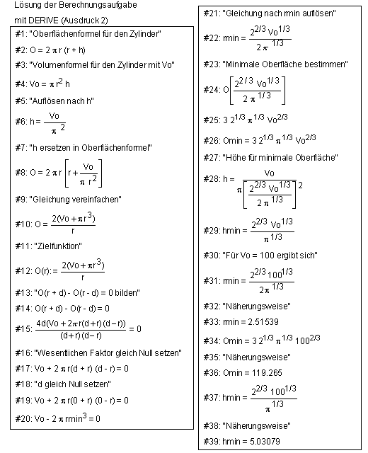 Die Zielfunktion ist gebrochen rational. Der Lösungsweg mittels Derive ist im Ausdruck 2 dokumentiert. Die allgemeine Lösung wird zum Schluß für V0 = 100 cm³ spezifiziert.