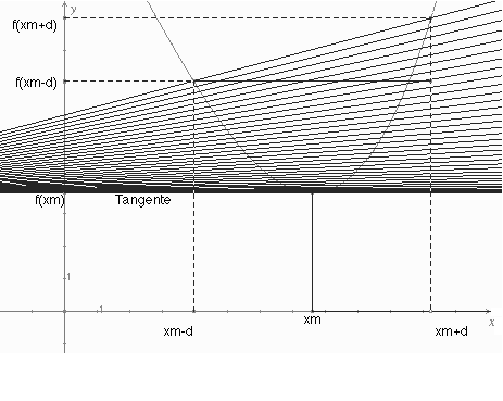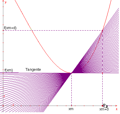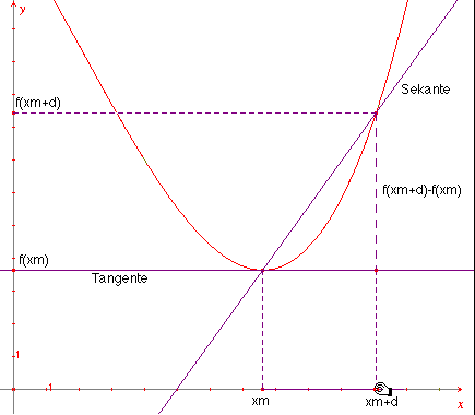 Die erste Möglichkeit (Abb. 2 a/b), bei der die Sekante durch den Extremalpunkt geht, illustriert die Methode nach der Fermat (1601-1655) die Extremstelle bestimmt: Es ist f(xm+d) - f(xm) » 0 für ein "hinreichend kleines d"; Division dieser "Gleichung" durch d ¹ 0 führt auf eine wesentliche Gleichung, in der dann d=0 für den Grenzübergang (Grenzlage der Sekante) zu setzen ist.