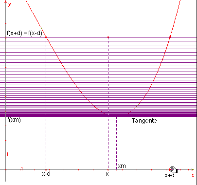 Funktionskurve, deren x-Koordinaten äquidistant zur Extremstelle liegen: Es ist f(xm+d) - f(xm-d) » 0 für ein hinreichend kleines d; nach Dvision mit d wird der Grenübergang durch Setzen von d=0 vorgenommen; man erhält eine Bestimmungsgleichung für xm.
