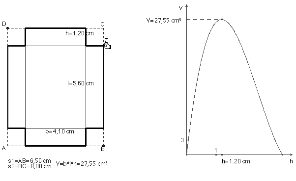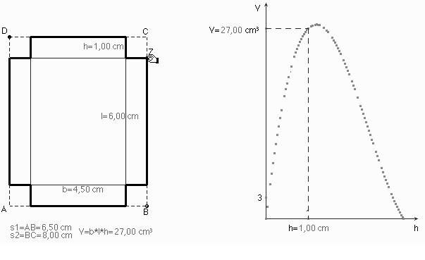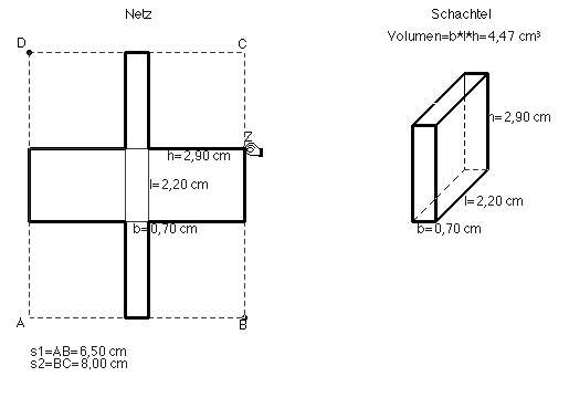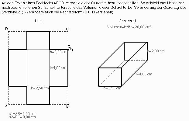 Es ist also folgende Berechnungsaufgabe (exakt) zu lösen: Welche Abmessung für h erzielt das größte Schachtelvolumen, wenn das Verpackungsrechteck die Abmessungen s1 = 6,50 cm und s2 = 8,00 cm hat.