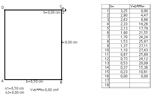 h = 0 und h = s1 ein Maximum annimmt. Um die Daten der unabhängigen Größe h und die zugehörigen Daten des von ihr abhängigen Volumens zu analysieren, können diese während der Änderung von h in eine Tabelle eingetragen werden (Abb. 7). Es erhärtet sich die Vermutung, daß zwischen den Randwerten von h ein Maximum angenommen wird.