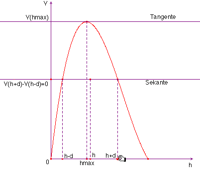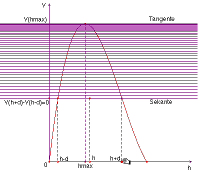 Wird d immer kleiner gemacht, so nähert sich die horizontale Sekante der horizontalen Tangente durch den maximalen Punkt an (Abb. 10 b) und der Mittelpunkt der entsprechenden Sehne läuft gegen den Extremalpunkt Abb. 10 c), d.h. in der vereinfachten Gleichung V(h + d) – V(h - d) = 0 ist d=0 zu setzen, um eine Bestimmungsgleichung für hmax zu gewinnen (vgl. die Zeilen 7-11 des Ausdrucks 1).