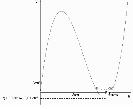 Die computergeometrisch ermittelten Näherungswerte können zu Kontrolle der approximierten Computeralgebraergebnisse dienen. Der Extremwert in Zeile 21 ist ein Minimumwert, das kann dem Schaubild von h ® V(h) bei erweitertem Definitionsbereich abgelesen werden. (Abb. 11) -Die Bestimmungsgleichung liefert eben alle Stellen, an denen eine horizontale Tangente existiert.