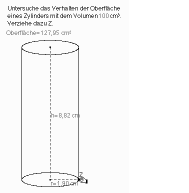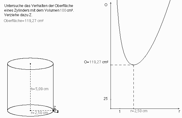 Das zugehörige Schaubild läßt für ein Volumen von 100 cm³ ein Oberflächenminimum von etwa 119,27cm2 bei r » 2,5 cm erkennen (Abb. 13)